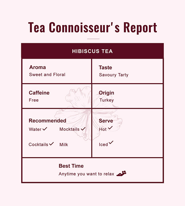 Appearance Crimson-red flower petals that are minimally processed to give you a naturally pigmented elixir that stimulates your visual and gustatory systems. Aroma A bouquet of pleasing, sweet, and flowery aromas. Taste Sour and earthy, with a trace of sweetness and a puckering sensation.