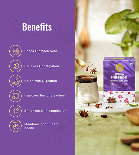 Regular price ₹ 493Sale price ₹ 493 Regular priceUnit price per₹ 725Gain a heap of health with this bouquet, like floral tea. Soothing mallow and rosehip flowers combined with a natural laxative called senna, cooling fennel, and aromatic star anise in this tea will prevent your stomach from twitching and turning.Sold out