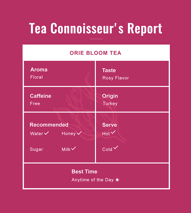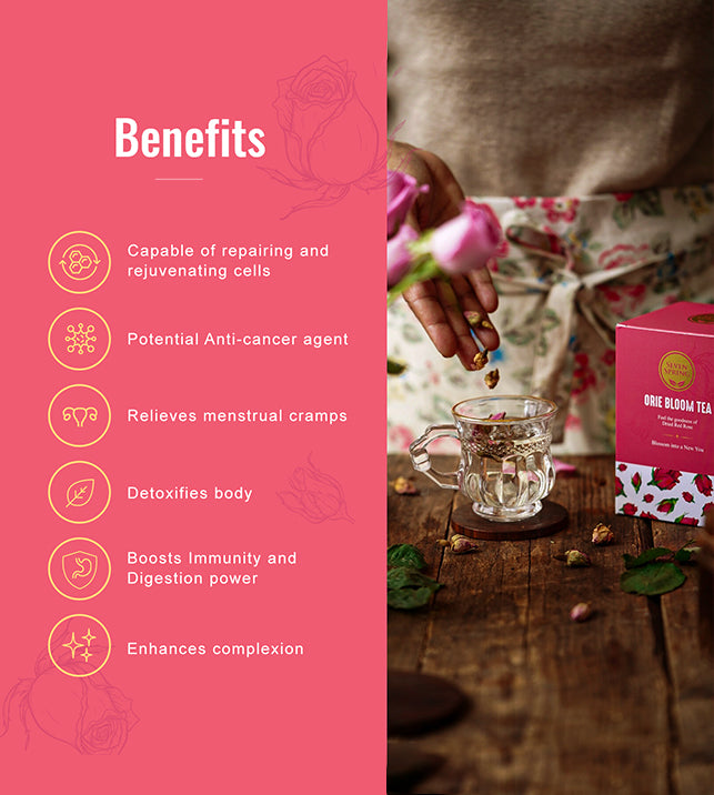 Appearance Pale pink rose buds that gives a pale yellow tea, soothing your visual senses. Aroma Mild Sweet and floral aroma that lasts only till it's warm. Taste A rosy sweet taste that sublimes into your palate.